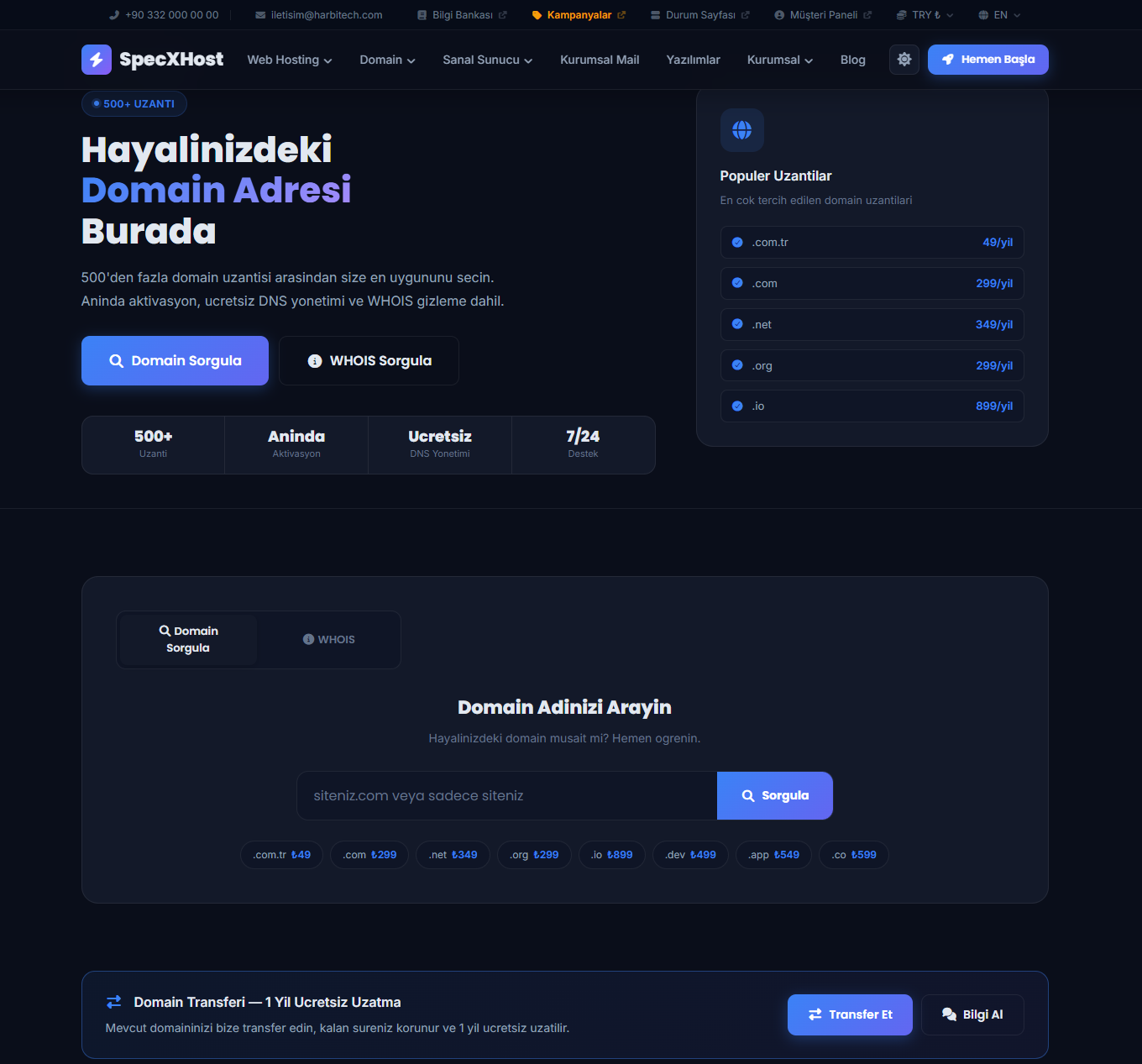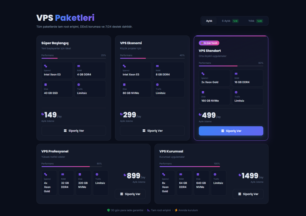 Hosting, domain ve sunucu satışına özel UI/UX yapısı